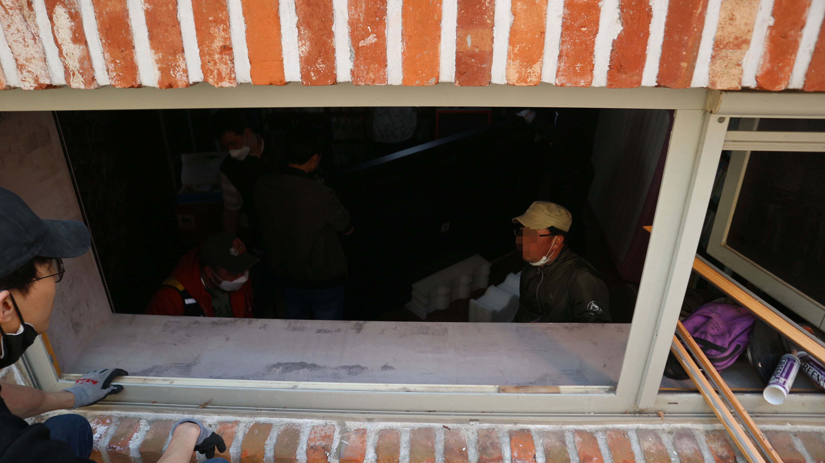 가까이 가보니 설치작업자들끼리 창문을 통해 대화를 주고 받고 있었네요.