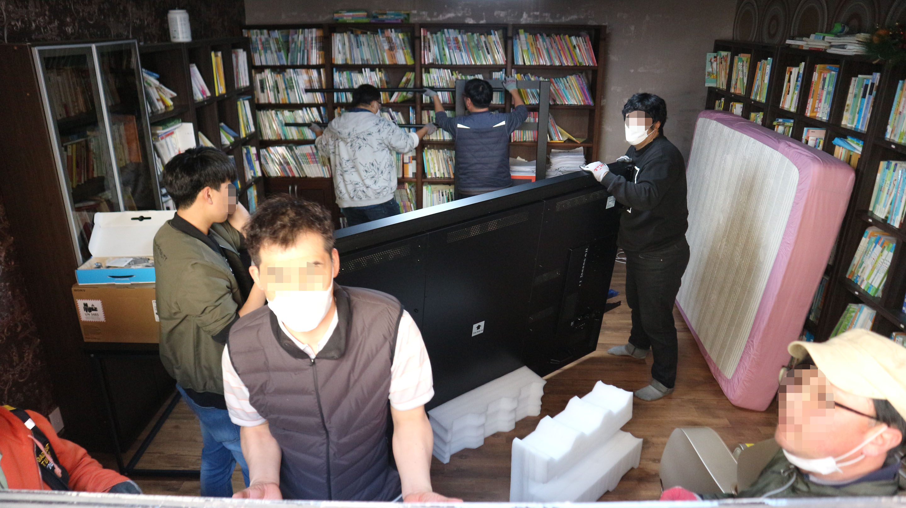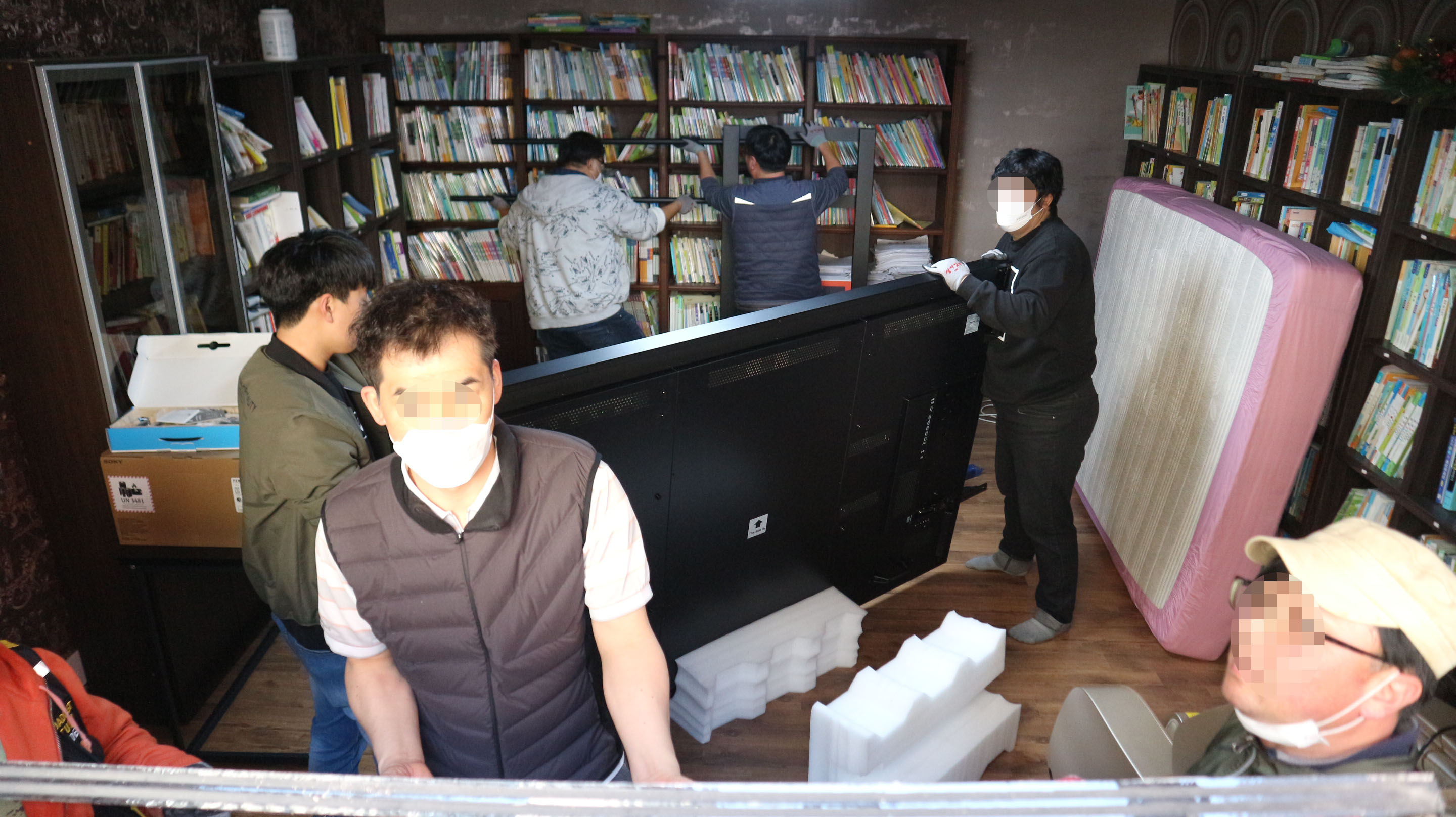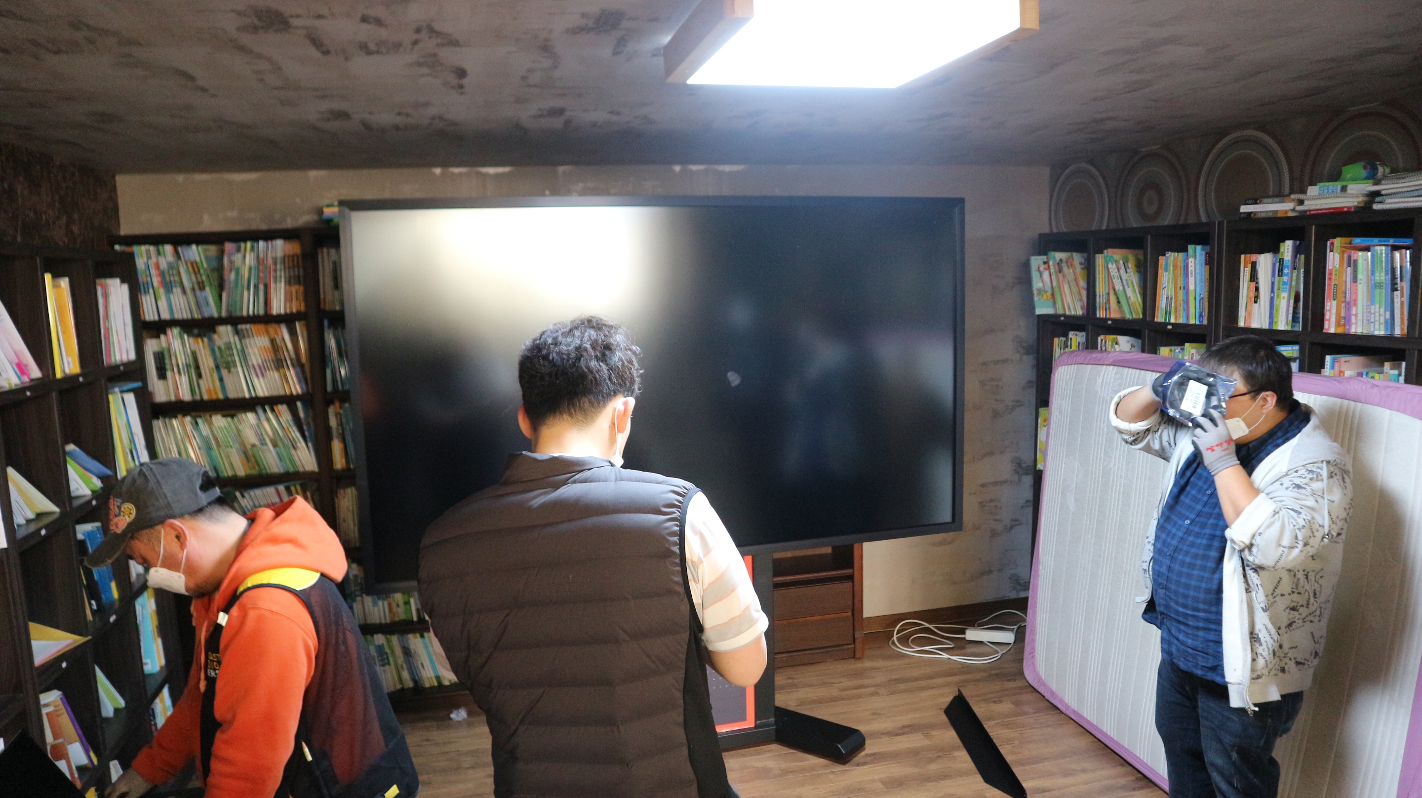 총 네 명의 작업자가 130kg 무게를 가진 98인치전자칠판을 계단으로 지하1층까지 안전하게 배송했구요.