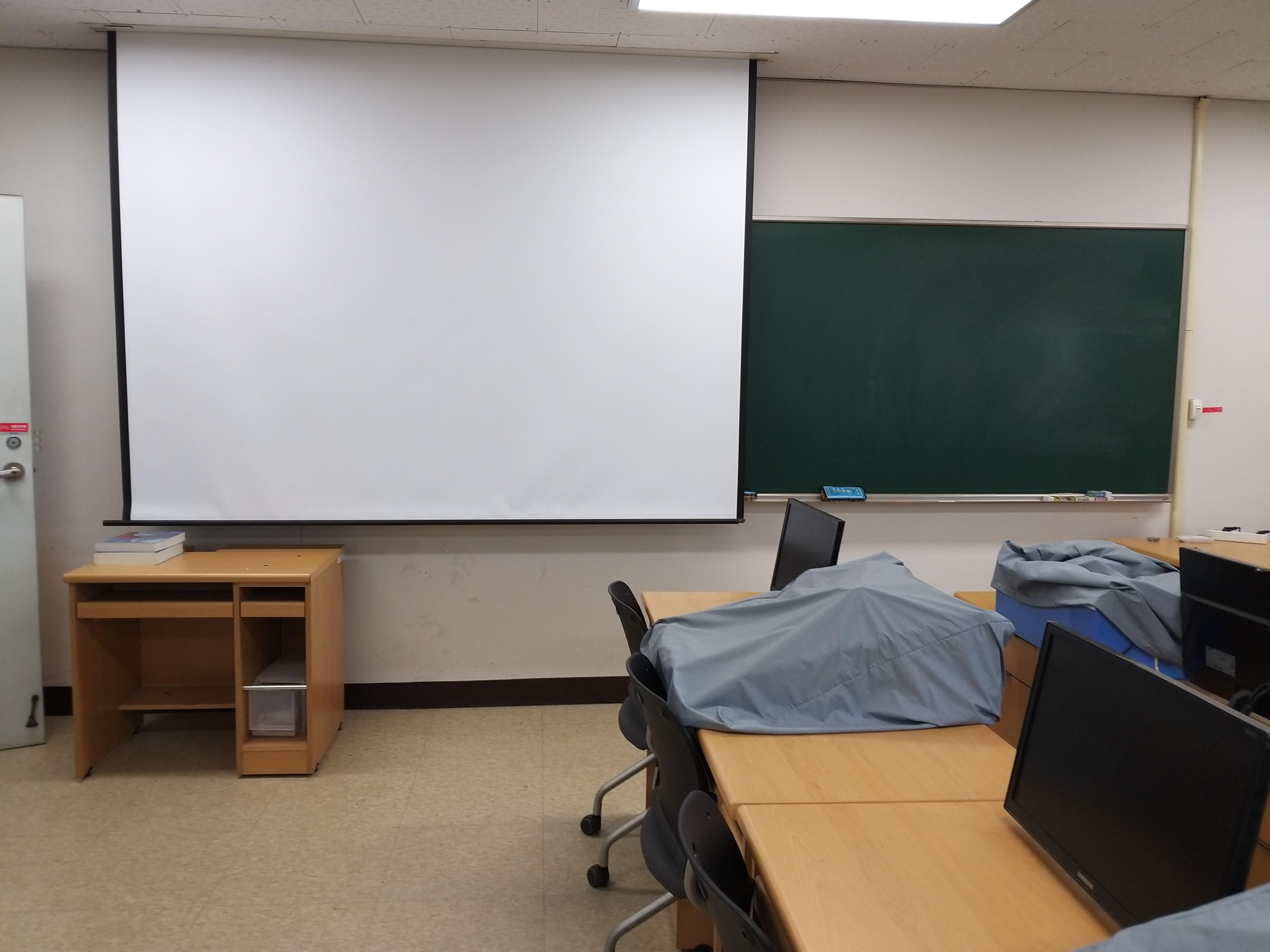 내부로 들어가니 분필칠판과 빔스크린이 설치되어 있는 모습이 보이네요!