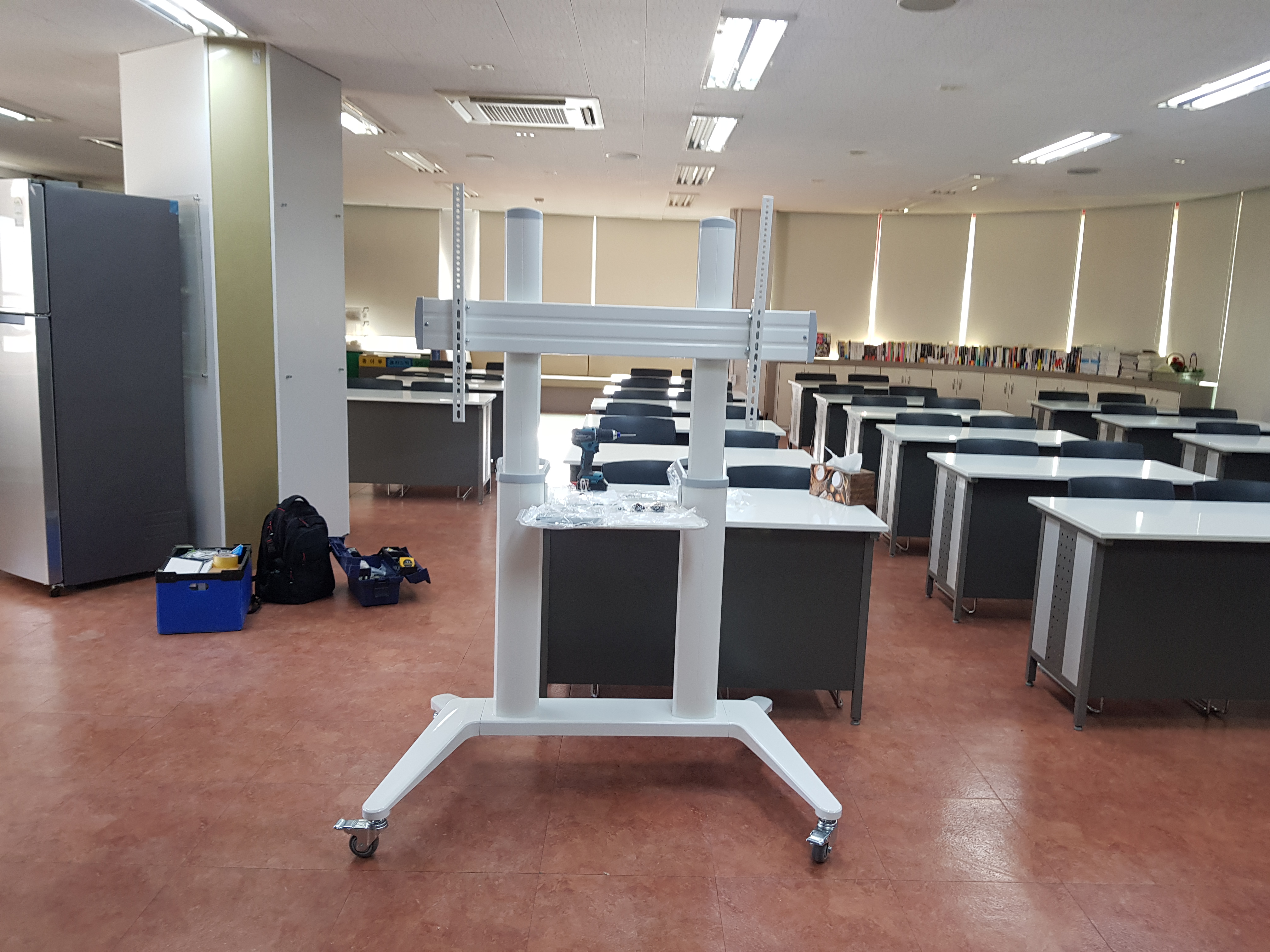 전자칠판을 스탠드에 결합한 상태에서 한번 더 고정을 해드리고 있습니다