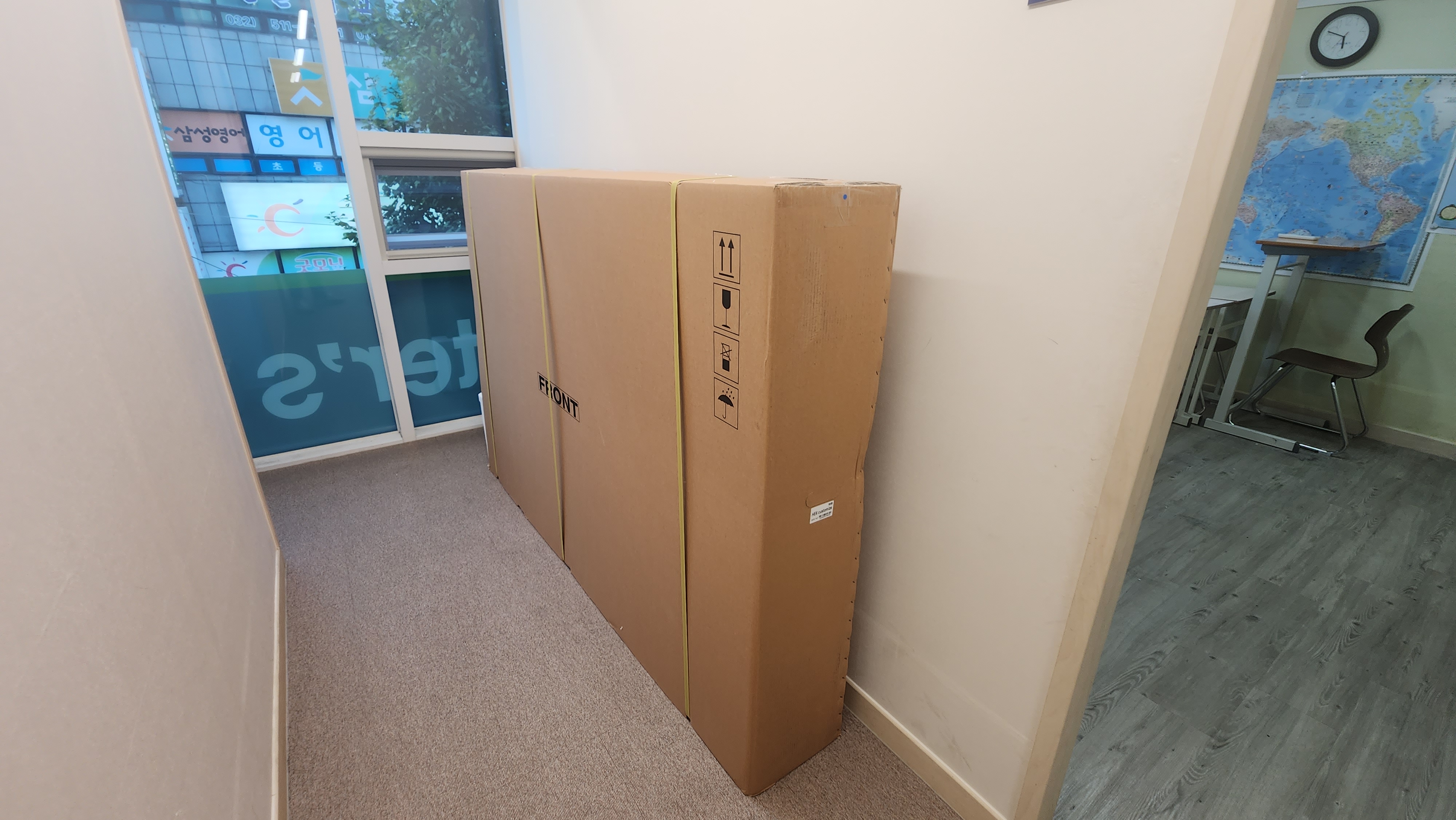 설치할 장소에 도착하셔서 전자칠판과 스탠드를 옮기신 모습입니다.