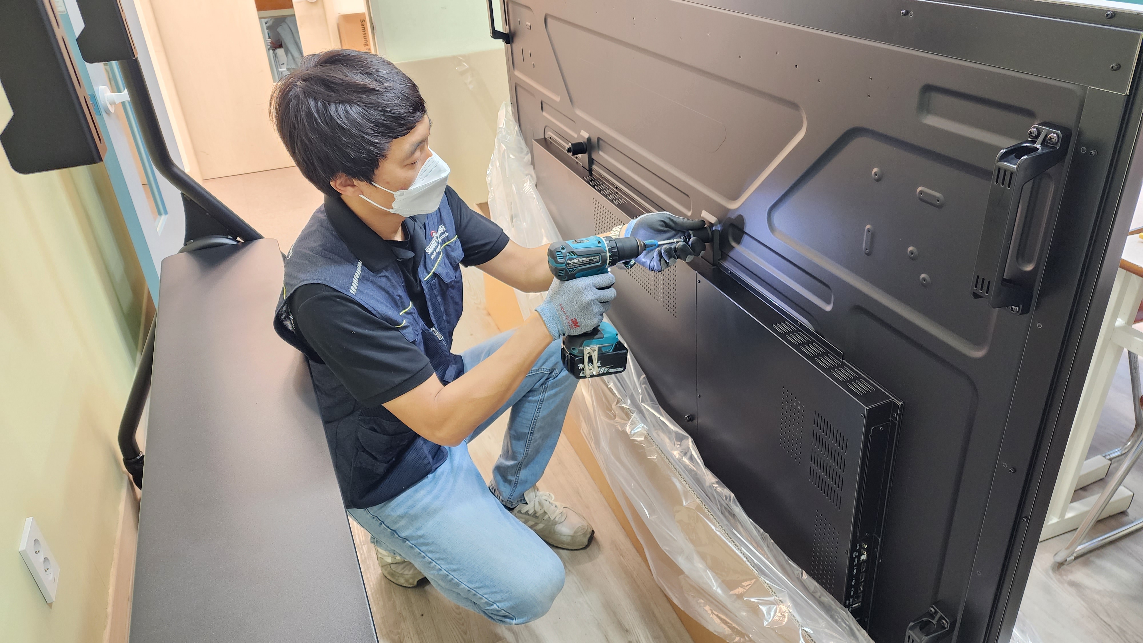 전자칠판 뒷면에 브라켓을 고정해주시는 모습입니다.