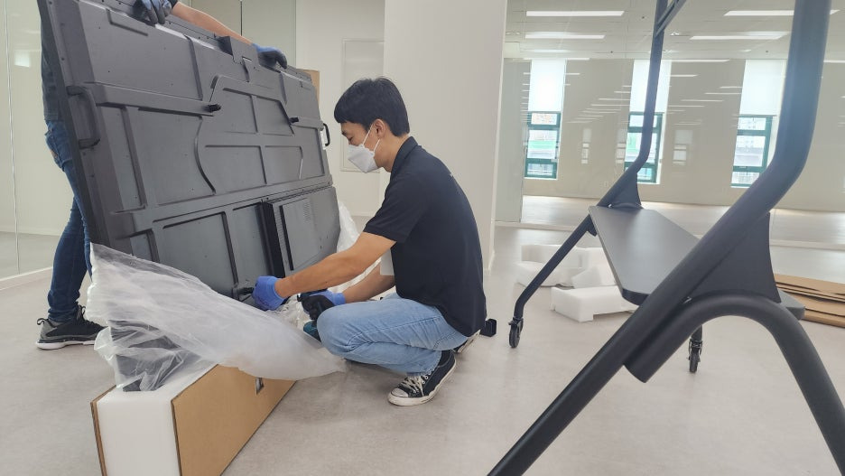 86인치 전자칠판을 꼼꼼하게 포장해 안전하게 이동합니다.