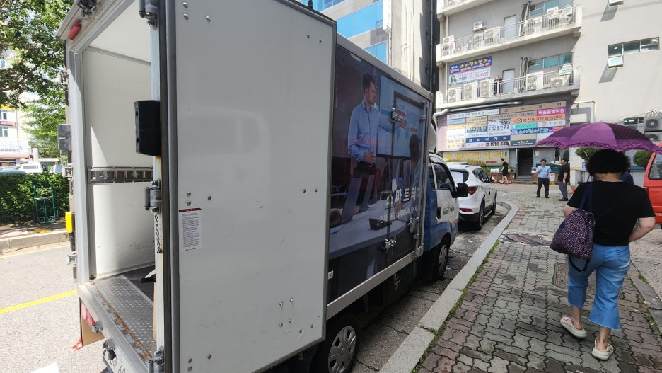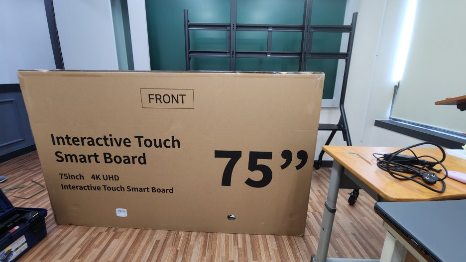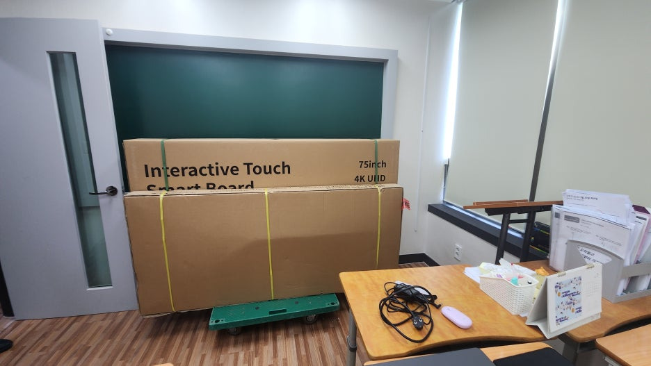 꼼꼼한 포장과 고정 후 75인치 전자칠판을 싣고 오늘의 설치 장소로 출발합니다!